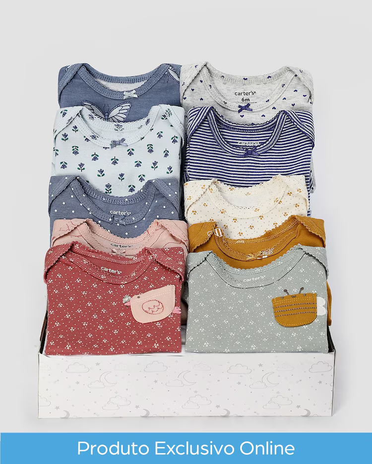 O Kit body bebê 10 peças borboletas abelhas e corações + caixa presente M multicor | Carter's é confeccionado em malha de ribana o que permite que o body acompanhe o crescimento do seu bebê. Super prático para ser utilizado no dia a dia dos papais, as peças contam com estampas de bichinhos e suas cores combinam com todos os momentos. Acompanha 1 caixa de presente super lindinha. Invista!